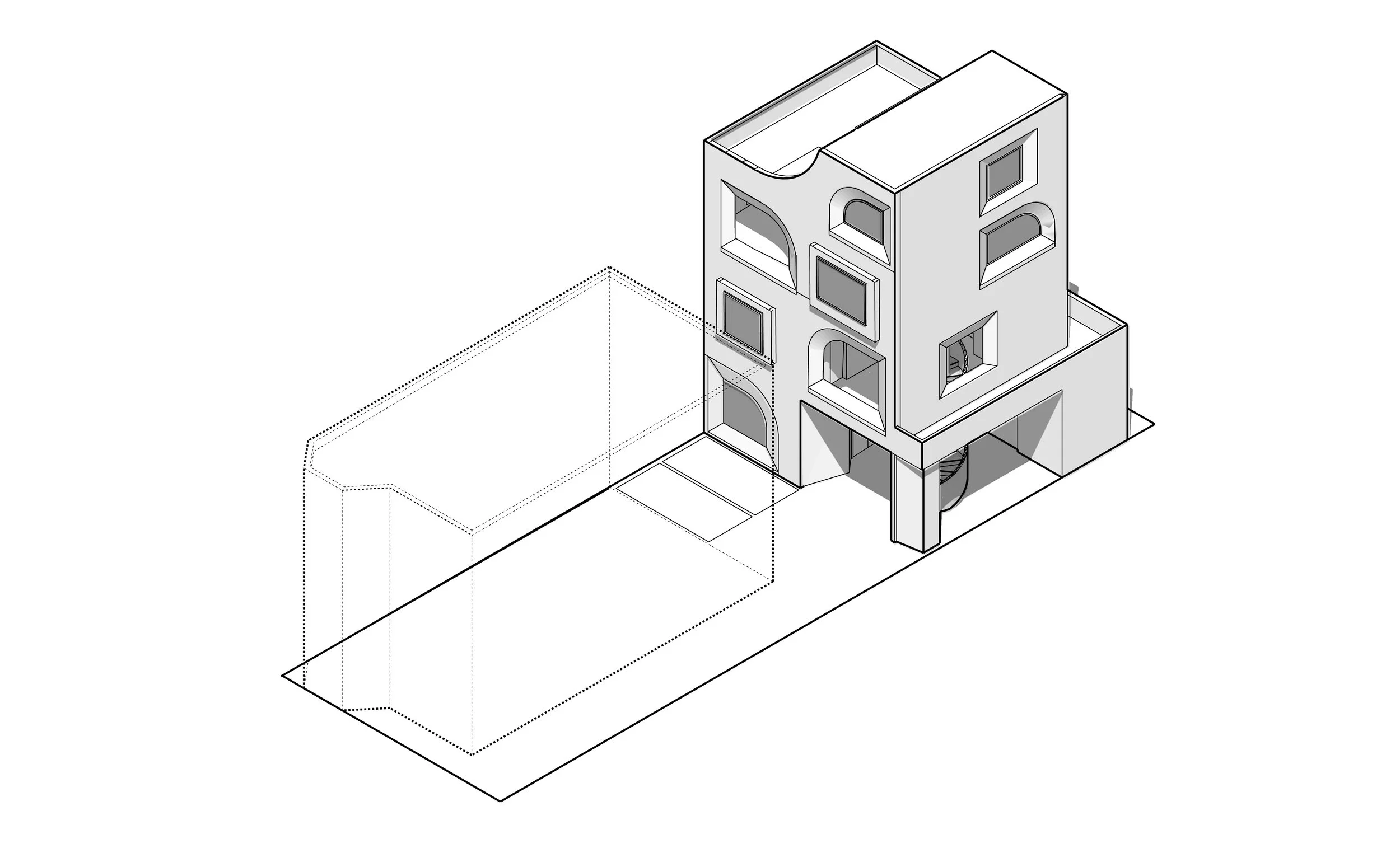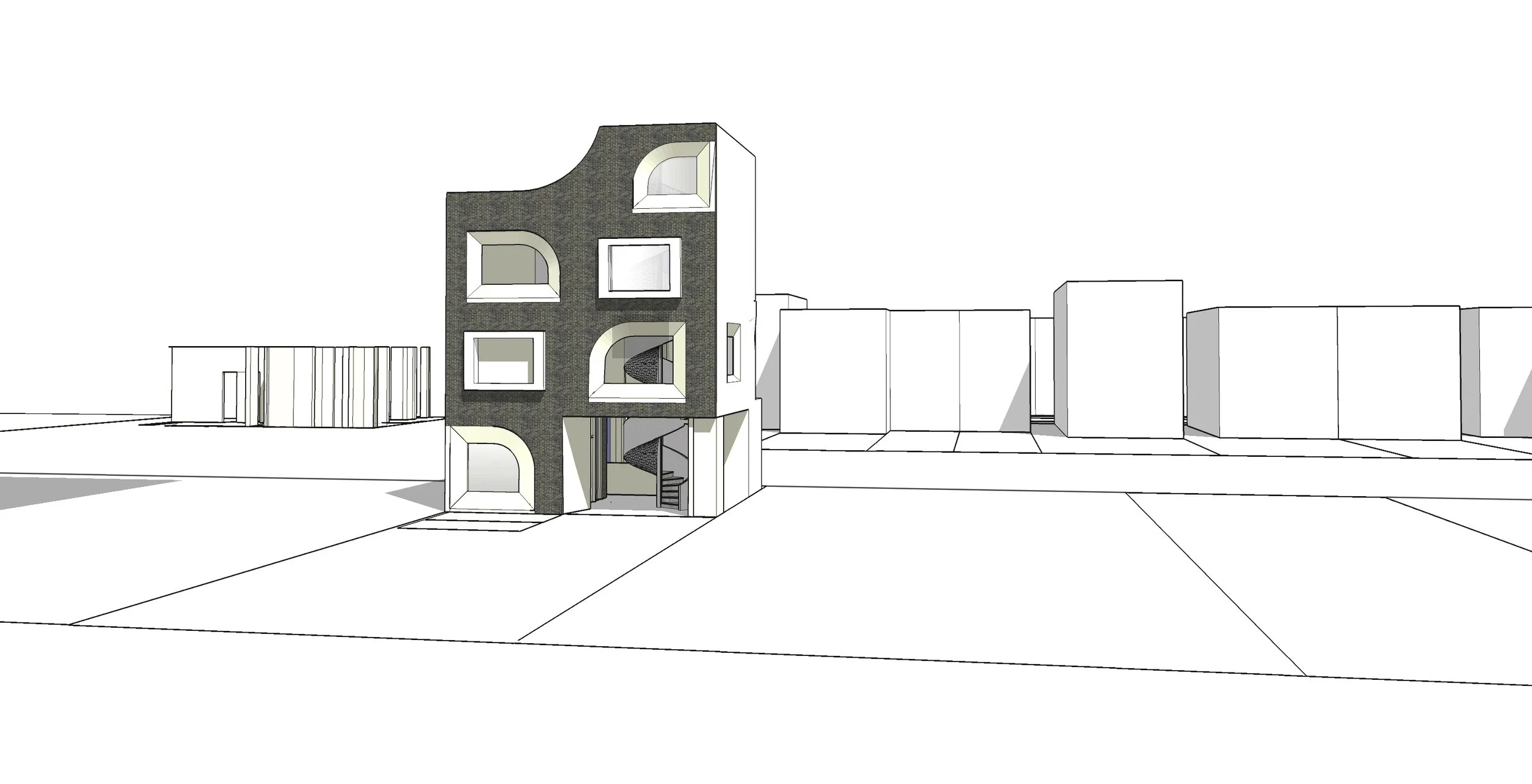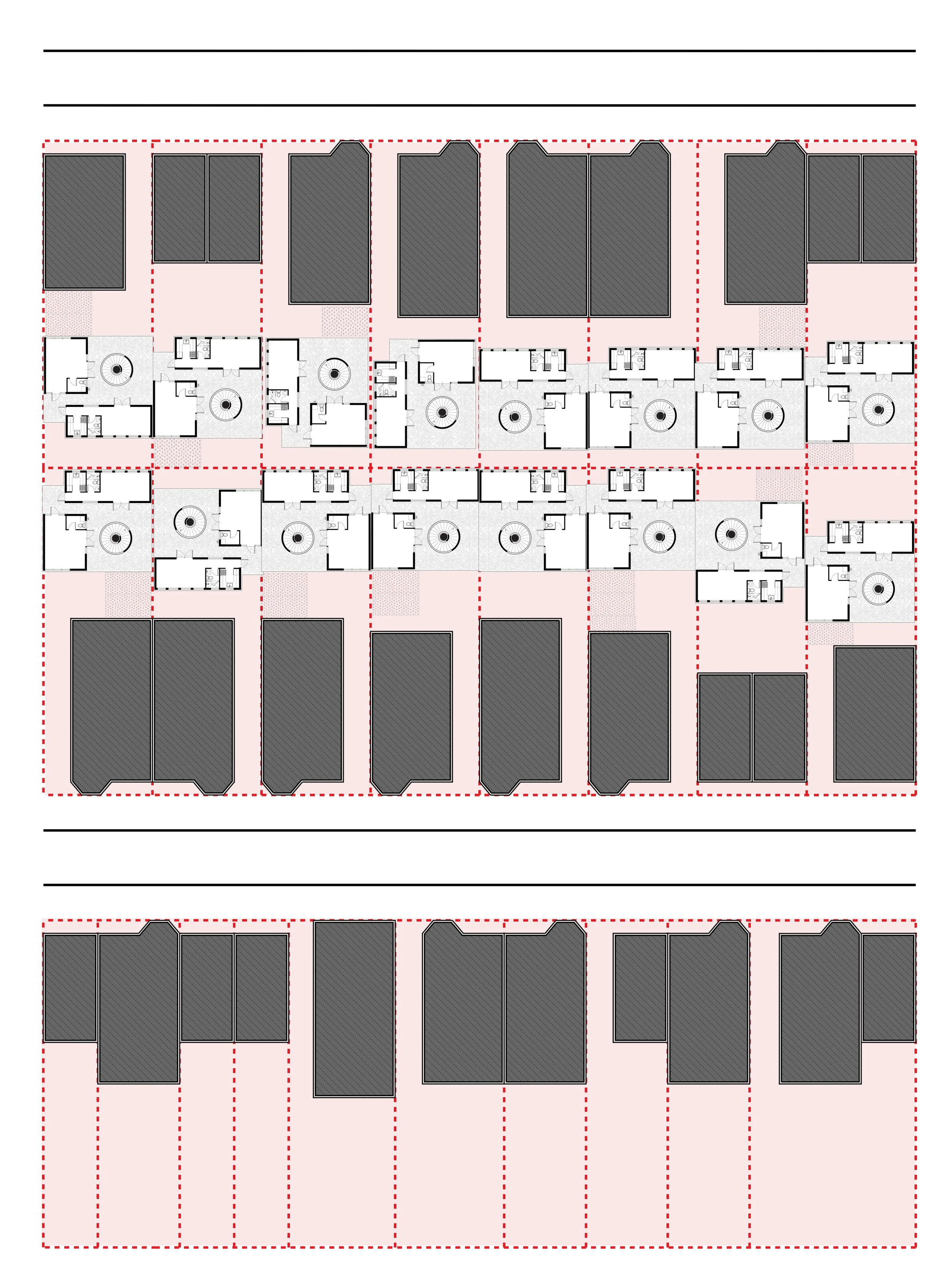 The project rethinks middle-class housing by making the backyard the center of block life, with accessory buildings serving as flexible infill on underused lots. Circulation within the block and buildings drives the design. A central core organizes units, while interior stairs enable smooth transitions between indoor and outdoor spaces, and a “bonus” half-floor fits within the three-story limit. Staggered layouts create varied yards, balancing private and shared outdoor space, while open ground floors activate courtyards and connect to the street. Alternating zero-lot lines provide both privacy and future adaptability, and a final layer of community spaces—such as small classrooms or health services—supports multigenerational, resilient neighborhood living.